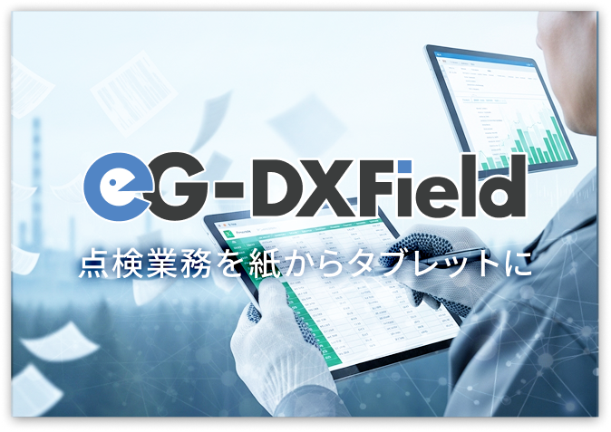 eG-DXFieldは現在ご利用のExcel帳票をそのままアプリ化し、タブレットを活用することで簡単にペーパーレスと現場作業のデジタル化を可能とするソリューションです。また、ワークフロー機能を有しており、作業結果の入力から結果承認までの業務を一気通貫で電子化し、蓄積されるデジタルデータの活用による業務改善をサポートします。
