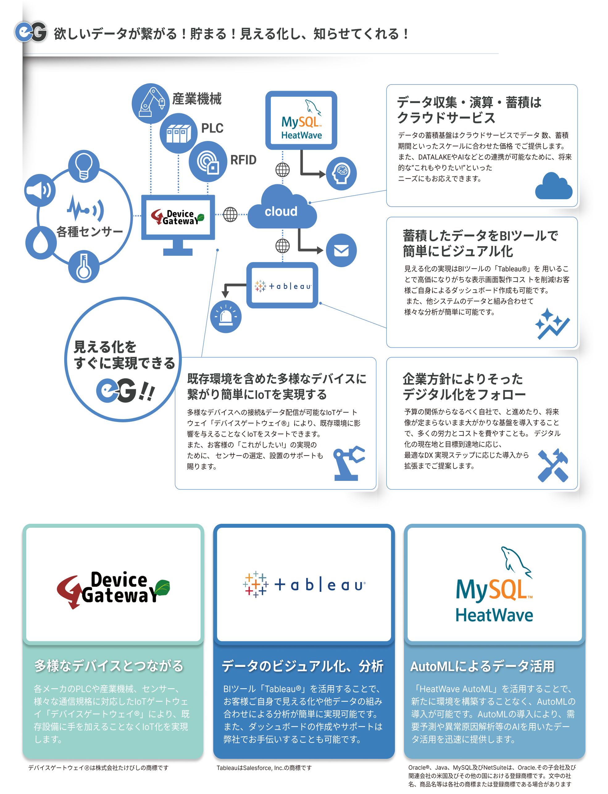 eG-IoTは簡単に「データ収集・集積と見える化」を実現する、クラウド型IoTプラットフォームサービスです。