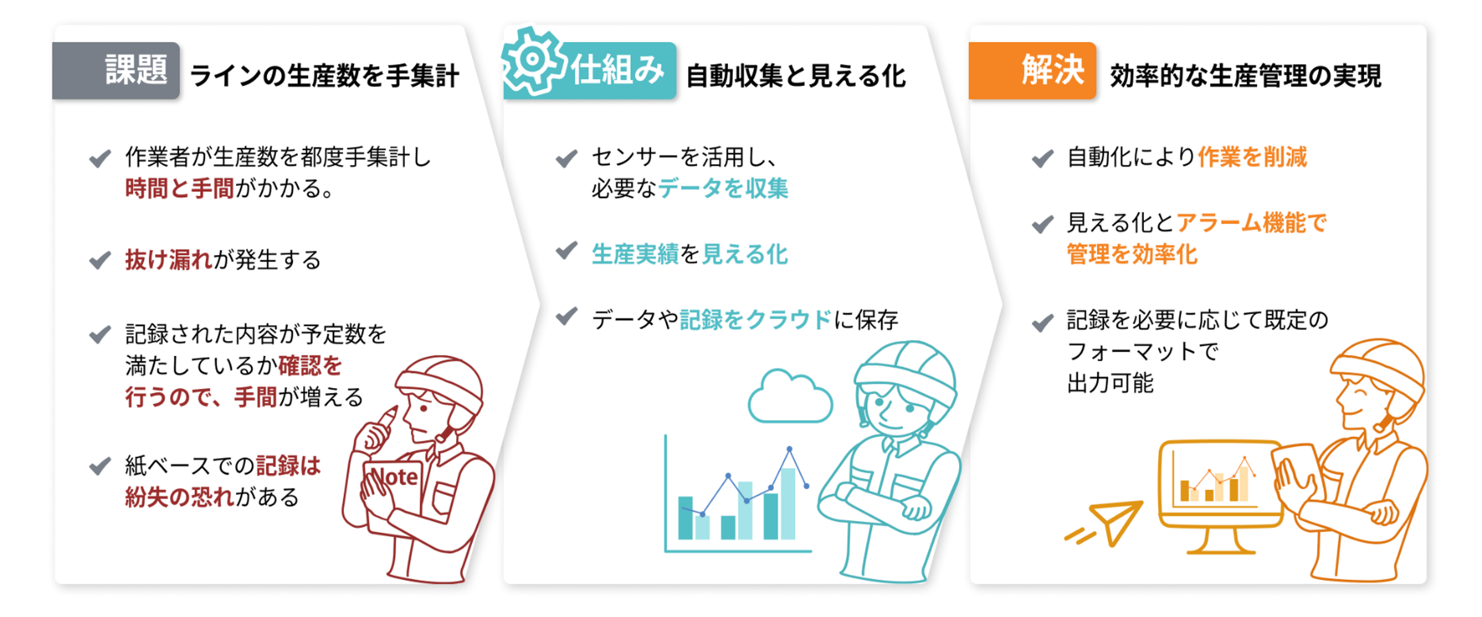 製造現場において、これまで人力で行っていた生産実績の集計作業を自動化し、生産進捗のリアルタイムでの見える化を実現。